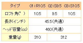 ●タイプ/01:R10.5、02:S9.5、03:S10.5●材質/ヘッド:6-4Ti鍛造(窒素ガス注入ヘッド)、シャフト:日本仕様モデル専用シャフト、グリップ:専用ドライコンパウンドグリップ●ヘッド:中国製、組立:日本●専用ヘッドカバー付●2年間保証書付●公式試合使用可※タイプ番号をご指定ください。